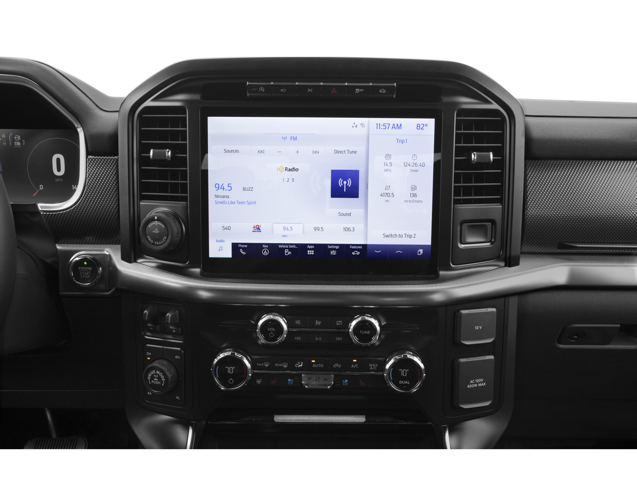 4WD, 17 Cast Aluminum Wheels, 360 Degree Camera, 4-Wheel Disc Brakes, 7 Speakers, ABS brakes, Adaptive suspension, Adjustable pedals, Air Conditioning, Alloy wheels, AM/FM radio: SiriusXM with 360L, Auto High-beam Headlights, Auto Start-Stop Removal, Auto-dimming door mirrors, Auto-dimming Rear-View mirror, Automatic temperature control, Brake assist, Bumpers: body-color, Compass, Connected Built-In Navigation, Convenience Package, Delay-off headlights, Driver door bin, Driver vanity mirror, Dual front impact airbags, Dual front side impact airbags, Electronic Locking w/4.10 Axle Ratio, Electronic Stability Control, Emergency communication system, Equipment Group 801A High, Exterior Parking Camera Rear, Forward Sensing System, Front anti-roll bar, Front Bucket Seats, Front Center Armrest, Front dual zone A/C, Front reading lights, Front wheel independent suspension, Front-Axle w/Torsen Differential, Fully automatic headlights, GVWR: 7,050 lbs Payload Package, Heated door mirrors, Heated front seats, Heated Steering Wheel, Illuminated entry, Integrated Trailer Brake Controller, Interior Work Surface, Lane Departure Warning System, Leather Trim Seats, Leather Trim Seats w/Heated 2nd Row, LED Projector w/Dynamic Bending Headlamps, Low tire pressure warning, Memory seat, Moonroof & Tailgate, Navigation system: Connected Navigation, Occupant sensing airbag, Outside temperature display, Overhead airbag, Overhead console, Panic alarm, Partitioned Lockable Fold-Flat Storage, Passenger door bin, Passenger vanity mirror, Pedal memory, Power door mirrors, Power driver seat, Power passenger seat, Power steering, Power Tailgate, Power Tilt/Telescoping Steering Column w/Memory, Power windows, Pro Trailer Backup Assist, Radio data system, Radio: AM/FM SiriusXM w/360L, Radio: B&O Unleashed Sound System by Bang & Olufsen, Rain-Sensing Wipers, Rear reading lights, Rear step bumper, Rear window defroster, Remote keyless entry, Rigid LED Fog Lamp, Security system, Speed control, Speed-sensing steering, Split folding rear seat, Steering wheel mounted audio controls, SYNC 4 w/Enhanced Voice Recognition, Tachometer, Tailgate Applique FORD, Telescoping steering wheel, Tilt steering wheel, Torsen Package, Tow Technology Package, Traction control, Trip computer, Turn signal indicator mirrors, Twin Panel Moonroof, Universal Garage Door Opener, Variably intermittent wipers, Ventilated front seats, Wireless Charging Pad, 4WD.